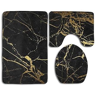 Badezimmerteppich mit Marmor-Muster, waschbar, rutschfest, 3-teiliges Set, Schwarz / goldfarben