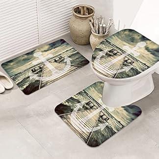 €15,00Produkt kaufenBadematte Badvorleger Set 3-tlg. Teppich, Nautisch, Ankerdruck in Meereswellen mit langem Holzsteg, bewölktem Himmel, 3D…