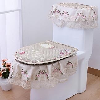 ZAZUZU 3 Stück/Set WC-Deckelbezug-Set mit Champagner-Spitzenblumen, mit 2 Taschen-Toilettendeckel und Tankbezügen, WC-Sitzkissen, WC-Sitz-Warmpolster