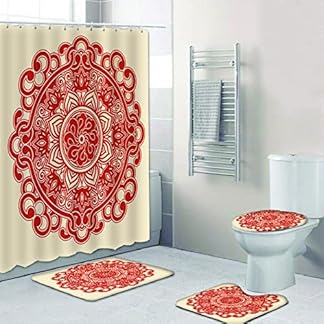 Duschvorhang Rot Khaki Retro Badezimmerteppich 4-Teiliges Set, Duschvorhang 180×180 Polyester+Badematte rutschfeste…