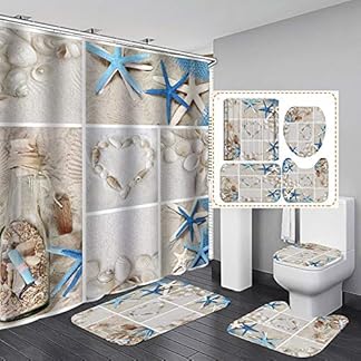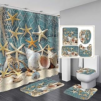 Bullpiano Seastar Duschvorhang Set Muscheln Seestern Strand Bad Duschvorhang mit rutschfesten Teppichen Toilettendeckel…