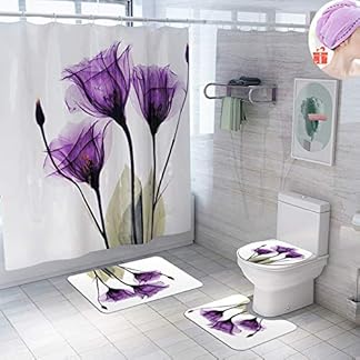 Enhome Badteppich Set 4teilig, Badezimmermatten Set mit Duschvorhang + rutschfeste U-Sockelteppich, Toilettenabdeung und…