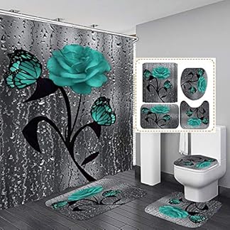 4 STK. Blumenduschvorhang-Sets mit rutschfesten Teppichen, Toilettendeckel und Badematte, Rose Flower Regentropfen…