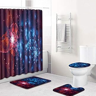 ZDDWLDL 4Pcs Duschvorhänge Set Mit Rutschfesten Teppichen,Toilettendeckel und Badematte Rote Blaue Sternenhimmelblumen…