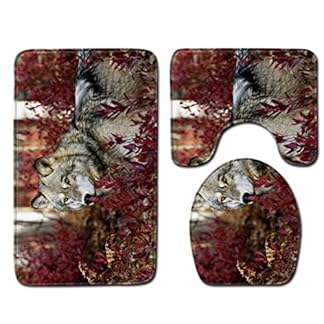 €22,18Produkt kaufen3 Teilig Badematte Set Tierwolf rote Blätter 3D Badematten Set rutschfest, Badezimmerteppich,U-förmiger WC-Vorleger,WC…