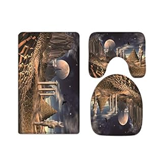 A.Monamour Badezimmer Badematte 3 Teilig Set Blau Sternenhimmel Runde Mond Felsen Berg Fantasie Szene Ägyptische Statuen Landschaft Kunst Flanell Badteppiche Badvorleger Badgarnitur WC Vorleger