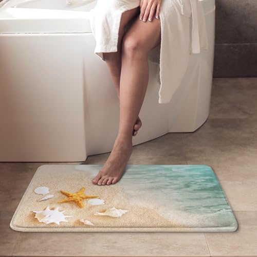 Die Größe des Badematten-Sets zwei Strand-Muschel-Badematten mit den Maßen 40,6 cm B x 61 cm L und 50,8 cm B x 81,3 cm L. Die verbesserte Badezimmermatte ist dicker als gewöhnliche Badezimmerteppiche. Es gibt ein Empfindung von Unterstützung und mehr Komfort, wenn Sie darauf treten. Schützen Sie Ihre Füße vor dem kalten Boden und schützen Sie gleichzeitig Ihren Boden vor Feuchtigkeit