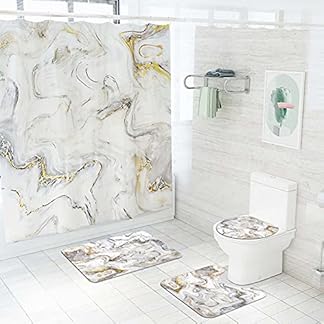 Komplettes Set mit 4 Badezimmervorhangteppichen 71″ x 71″, Duschvorhang 29,5″ x 17,7″, rechteckiger Teppich 17,7″ x 14,5″ und Toilettendeckelabdeckung 16,5″ x 14,5″