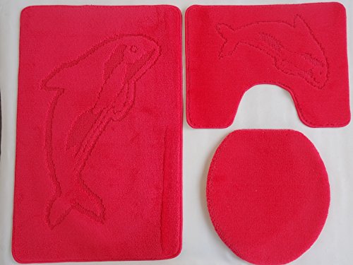 Ilkadim Delphin Badgarnitur 3 TLG. Set 55×85 cm einfarbig, WC Vorleger mit Ausschnitt für Stand-WC (rot)