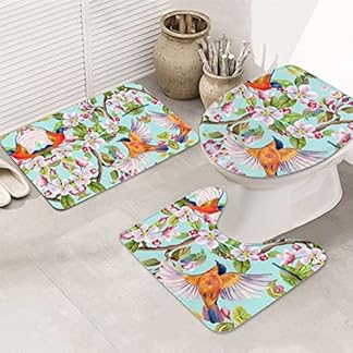 Teppich-Set für Badezimmerteppiche, 3-teilig, inkl. Konturteppich und Toilettendeckelbezug, Blumenvögel mit rosa Aufdruck, 3-teilig