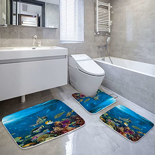Unterwasser-Ozean, bunter tropischer Fisch-Schildkröte, Korallen-Badvorleger, Badematten-Set, 3-teilig, Memory-Schaum…