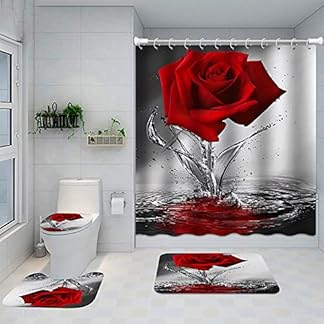 €34,00Produkt kaufen4-teiliges rotes Rosen Duschvorhang Set mit rutschfesten TeppichenToilettendeckelabdeckung und Badematte,wasserdichter Polyester-Duschvorhang für Badezimmer mit 12 Haken Home Badezimmer-Dekor-Sets